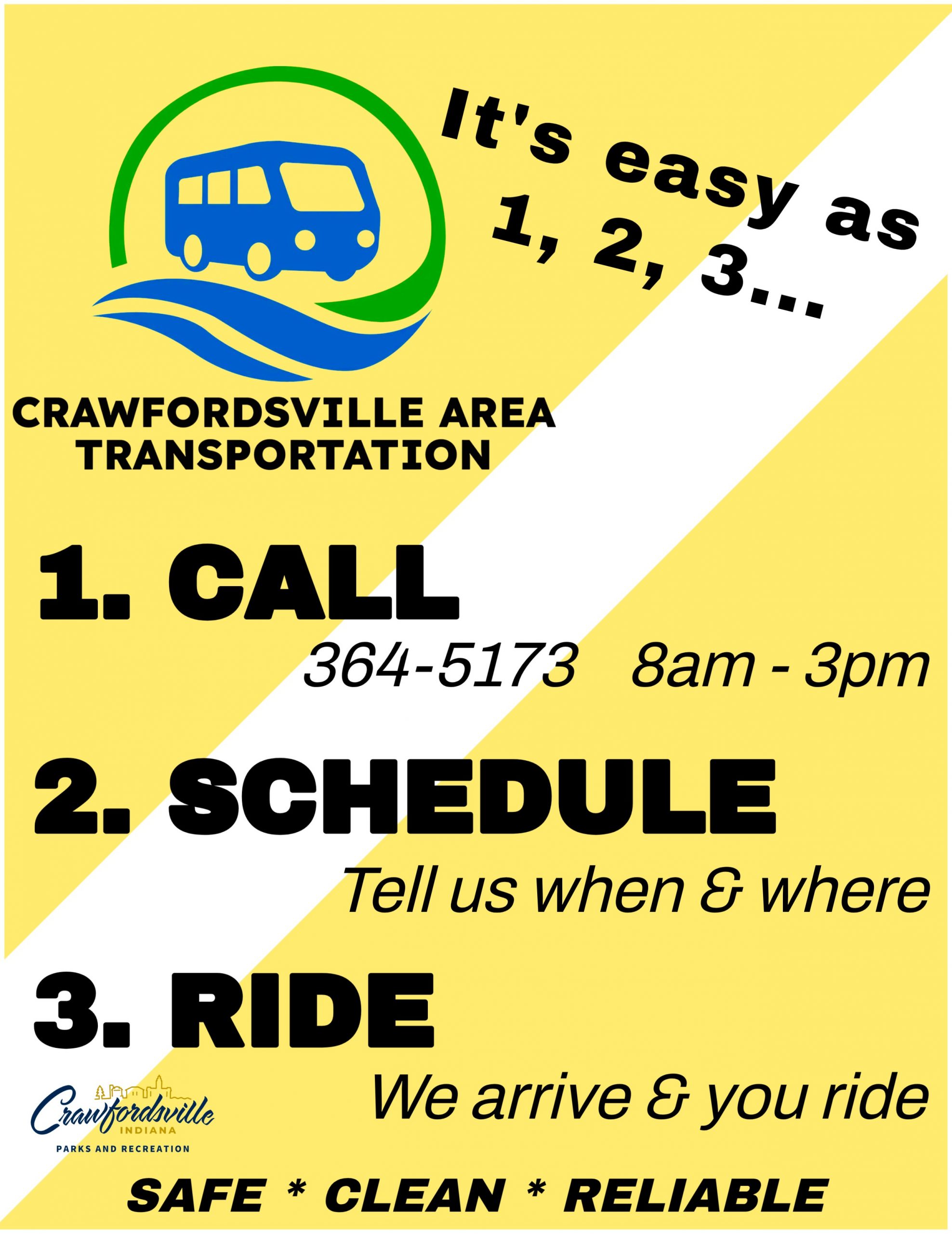 Visit https://www.crawfordsville.in.gov/452/Public-Transportation?fbclid=IwY2xjawQxIfBleHRuA2FlbQIxMABicmlkETF3Vm9BWW81SHBYQUc4Q25zc3J0YwZhcHBfaWQQMjIyMDM5MTc4ODIwMDg5MgABHgZkb2bKd1rSB7h0Lfa4t7bo-nUSM5nn3HY2wNbY4pqiQiKzIv2urPFP62ZP_aem_FFj6F4SkY0yQgm8xMlm5LQ for more information!