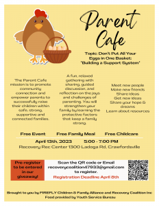 This Parent Cafe is brought to you by Firefly Children & Family Alliance and the Recovery Coalition Inc. Food provided by the Youth Service Bureau.