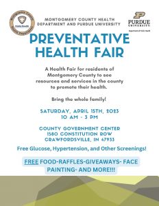 FreeMontgomery County Health Department is partnering with Purdue University to host the Preventative Health Fair on Saturday, April 15th from 10 AM to 3 PM at the Montgomery County Government Center.