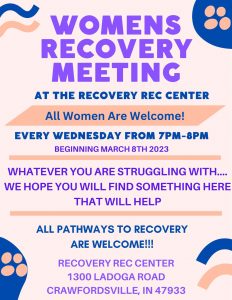 The Recovery Rec Center holds Women’s Recovery Meetings every Wednesday from 7 PM to 8 PM at the Recovery Rec Center.