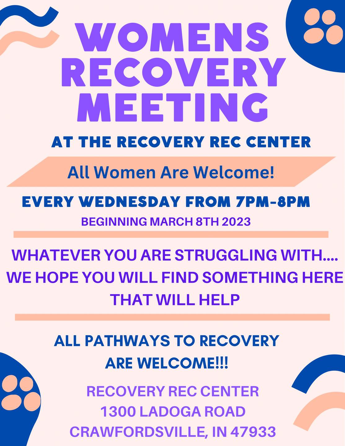 FreeThe Recovery Rec Center holds Women’s Recovery Meetings every Wednesday from 7 PM to 8 PM at the Recovery Rec Center.