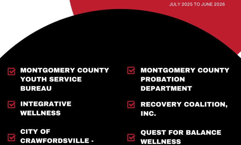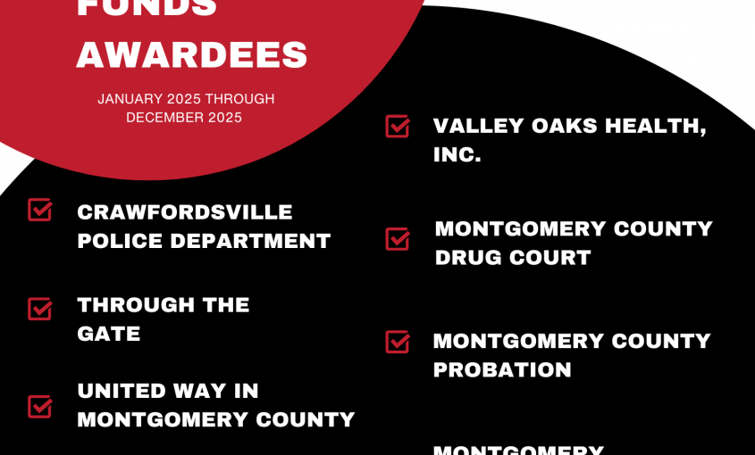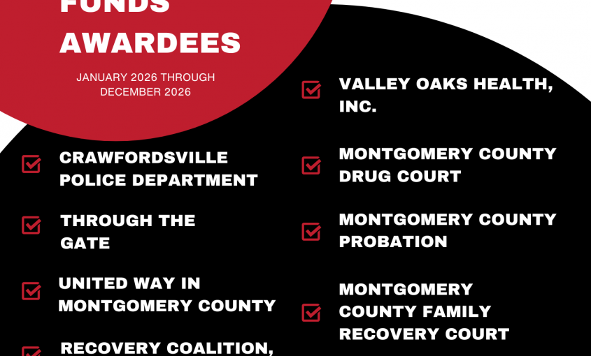 Read More...In 2025, 14 Opioid Settlement Funds Mini-Grants were awarded to the following organizations for the 2026 year: United Way of Montgomery County, Crawfordsville Police Department, Boys & Girls Club, Montgomery County Sheriff’s Office, Montgomery County Probation Department, Through the Gate, Integrative Wellness, Valley Oaks Health, Recovery Coalition, HUE, Montgomery County Drug Court, Montgomery County Family